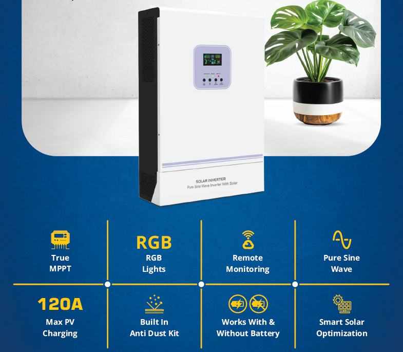 Next-generation 10.2kW hybrid inverter featuring a Unity Power Factor (1.0) and Dual Output functionality for smart load management. Capable of running without a battery, it includes a built-in anti-dusk kit for harsh environments and supports Wi-Fi/GPRS remote monitoring.